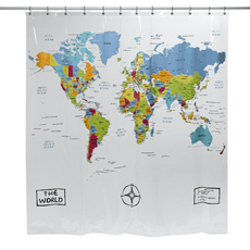 A vinyl shower curtain printed with a world map. Is it weird that I'm excited about a shower curtain? Whatever, it's awesome. We picked out bath towels and bathroom accessories in the various colors on the map- pink, green, blue, and yellow.